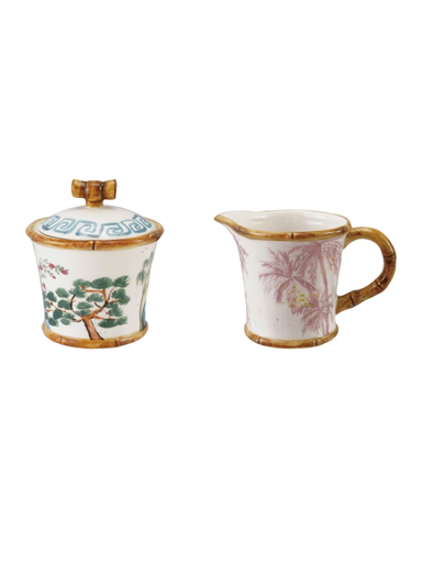 The sweetest finishing touch for your coffee or tea service. This hand-painted stoneware cream and sugar duo features delicate scenic artwork, warm...