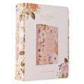 Peach, pink, and cream floral prints cover, Pastel peach faux leather, Rose gold-foiled title, Strength and honor are her clothing and she shall rejoice in time to come, Proverbs 31:25, Allison Loveall design, King James Version, Note-taking Bible, Softcover, 1.6-inch lined margins, 2-inch wide overall margins, 1450 gilt-edged pages, One-color interior, 2 ribbon markers, Thematic verse finder, One-year reading plan, Concordance, Epistle Dedicatory letter, 8 full-color maps, 8.65 point type, Size: 8.2" x 6.5" x 2" (208 x 165 x 51mm)