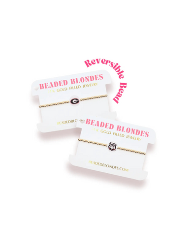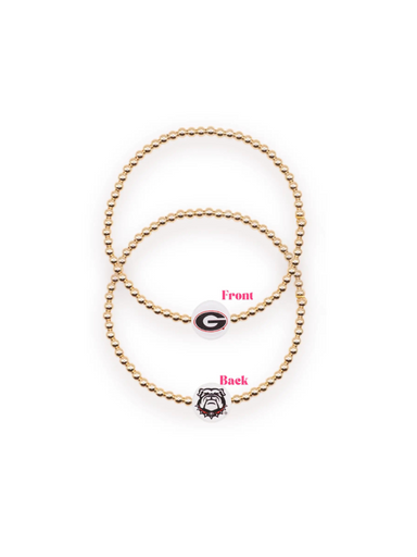 Two silver tone seed bead stretch bracelets connected with a crystal Georgia logo charm. Charm measures around 1”.