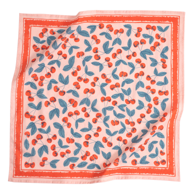 Color and Pattern: Pink with red cherries and green stems Material: 100% premium cotton Sizing: 22x22 inches Designed in the U.S. Hand screen-print...