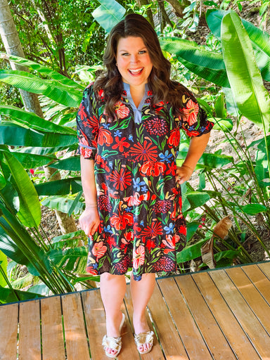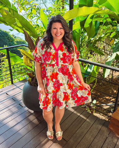 Feminine, playful, and effortlessly flattering, this dress is a standout for any occasion. It features a split V-neckline accented with contrast t...