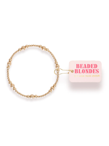 3MM gold bracelet with 4MM & 5MM cascading gold design. • 14 K gold filled & elastic string • Handstrung in College Station, Texas. • Wa...