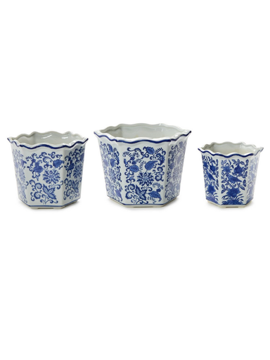 Choose from 3 sizes in these Blue Willow Hand-Painted Chinoiserie Planters! Showcasing timeless blue-and-white artistry with intricate floral moti...