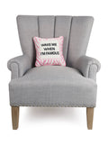 Playful and full of personality, this statement pillow adds a fun, stylish touch to any space. Featuring the bold phrase “Wake Me When I’m Famous” in classic black lettering, the design is framed by a soft pink and ivory patterned border that gives it a chic, preppy feel.