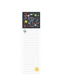 A list notepad displaying vibrant hand illustrated designs of flowers, sun, and nature surrounding an inspirational sentiment that reads "Be Proud Of Who You Are And What You Do." List pad also features lined writing space underneath with flower and smiling sun designs. Pad includes 60 pages and a strong magnet to easily hang on magnetic surface for display.