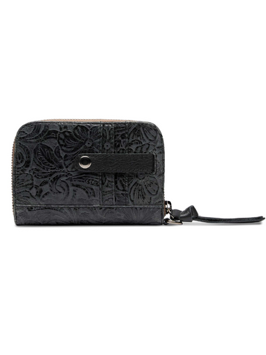 $145.00| /Ember black glitter exterior Zipper closure Two interior slide pockets Twelve credit card slots Trimmed in natural, untreated leather 7 ¾” (W) x 4...
