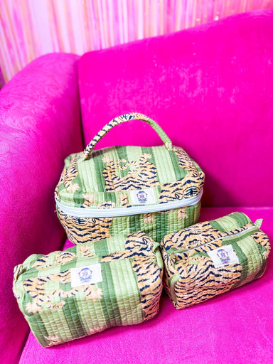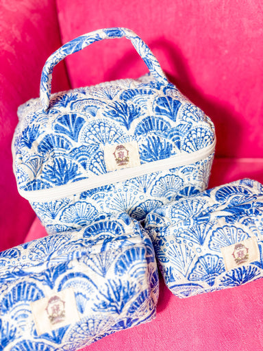 These are hand quilted and crafted in India using block printing. The large cosmetic bag has pockets on the inside, the medium and small size cosme...
