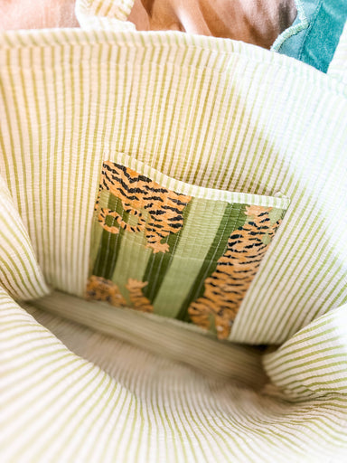 These are hand quilted and crafted in India using block printing. Each bag size includes inside pockets and are lined for easy cleanup!