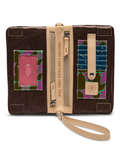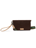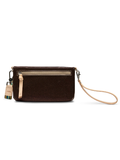 - Included detachable wristlet strap and adjustable woven crossbody strap