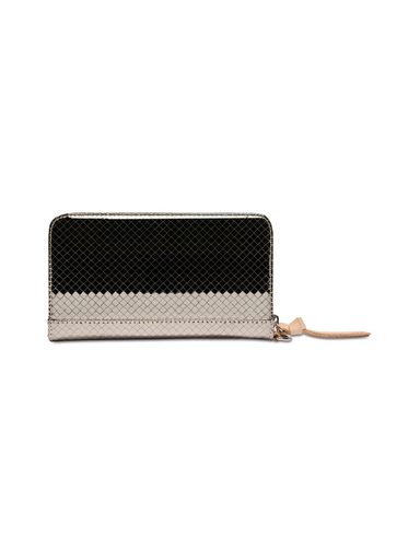 Kyle gunmetal metallic exterior Zipper closure Two interior slide pockets Twelve credit card slots Trimmed in natural, untreated leather 7 ¾” (W) ...