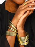This set of 6 Etoile BuDhaGirl Bangles shimmers and glistens reflecting hints of pale gold starlight kissed by moonbeams. The interplay of light and color in Etoile is the result of years of dedicated and careful development to obtain a proprietary color that showcases the beauty of gold unlike any other before and reaffirms BuDhaGirl’s commitment to beautiful objects imbued with deeper meaning.