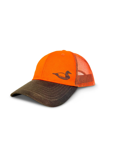 Blaze orange polyester front panels and mesh back Heavy-duty waxed cotton bill Adjustable snapback closure One size fits most Lightweight...