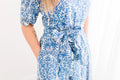 The scalloped sleeves and scalloped waist tie make this dress a show stopper! This dress was handcrafted using block printing by skilled artisans in India. The block printing process may have variations in ink colors due to the handcrafted nature which is what makes each dress unique! Dresses can be machine washed on cool, air dry to preserve the quality of the block printing.