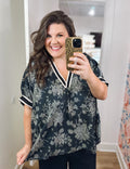 Runs oversized. Jenna is wearing a 1X for a very loose fit and could have also worn an XL.
