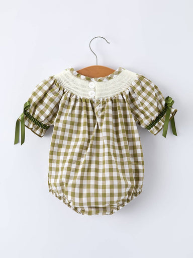 Adorable green plaid romper featuring hand-embroidered fish details and classic smocking across the chest. This one-piece wonder combines timeless ...