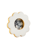 The Circle Scallop Marble Frame is a stunning piece that combines the elegance of marble with a touch of gold foil. With its scalloped edge adorned with gold foil, this frame adds a luxurious and sophisticated touch to any space. It is designed with an easel back, making it effortless to display on any surface.