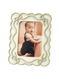 A decorative photo frame displaying a scalloped design with embossed green ribbon designs for added dimension. Frame fits a 5 inch by 7 inch photo and can easily be replaced via clips on back.