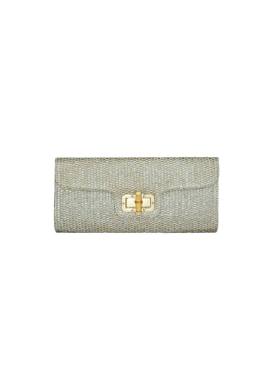Add a touch of texture and sparkle to any outfit with this beautifully woven clutch. Featuring a neutral woven body and a vibrant embellished front...