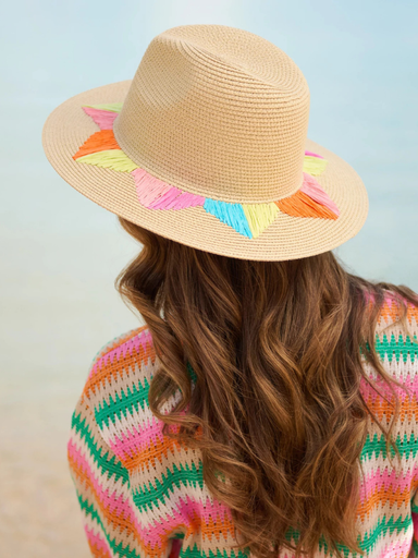 Ciela hat is crafted from paper straw and features a bold sunburst pattern made of layered raffia fringe in vibrant shades of pink, orange, lime, a...