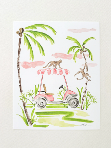 Bring a little island whimsy to your space with this charming 5x7 watercolor art print. Featuring a pink golf cart tucked beneath breezy palm trees...