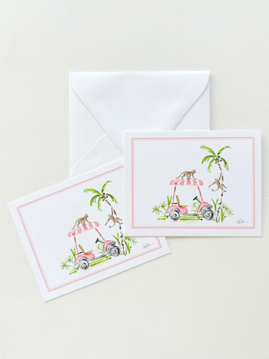 Bring a little island whimsy to your space with this set of 5 notecard set. Featuring a pink golf cart tucked beneath breezy palm trees and mischie...