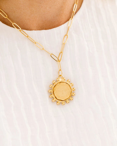 A beautiful bright French glass set in hand cast gold on a dainty gold chain. Made in the USA