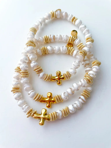 Wear your faith with a Cola Stack's cross bracelet! This beautiful, neutral women's bracelets features a detailed white 6mm bead size with gold-pla...