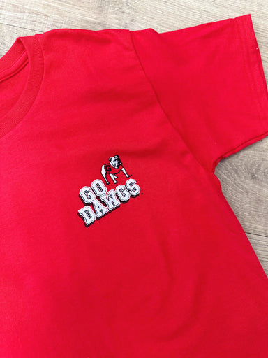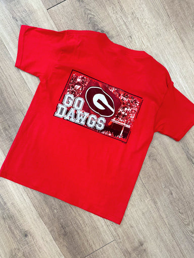 Cheer on the Georgia Bulldogs in your new favorite tee with the Georgia flag flying across the football field! Gildan Tee Available in Youth S - XL