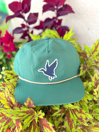 Our Flying Duck Silicone Patch mid profile, structured snap back rope hat. Decorated right here in the USA. Embroidered patch and mid profile hat c...