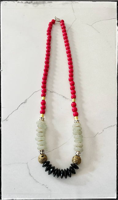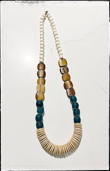 Measures 17” long Necklace is strung with antiqued bronze toggle closure