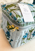 Measurements: Large: 6” H x 10” W x 9” D Medium: 6” H x 9” W x 4” D Small: 4” H x 7” W x 4” D Perfect for home or travel, the Quilted Luxe Cosmetic Bag Set is your go to! Search criteria: Tote Bag, Quilted Bag, Travel Bag, Block Print, Blockprint, Resort, Beach Bag, Cosmetic bag, travel bag