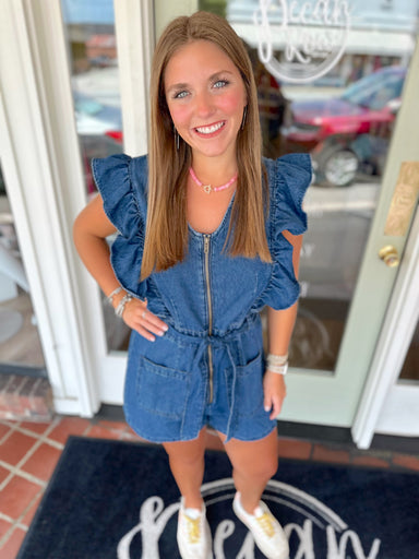 Available in S-L Self: 100% Cotton Lining: 97% Polyester, 3% Spandex Romper has pockets! True to size, Megan is wearing a medium