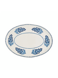Blue Block Print Platter. This exquisite hand-stamped stoneware platter features a captivating blue block print design, meticulously crafted to add a touch of elegance to any dining setting. The platter is adorned with a hand-painted dotted rim, enhancing its artistic appeal and making it a standout piece for serving.