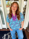 Chic and easy, this printed top features a flattering V-neck with a stand collar and eye-catching contrast trim. Finished with elastic sleeve openings and a lightweight, non-sheer feel, it’s perfect for effortless everyday style.