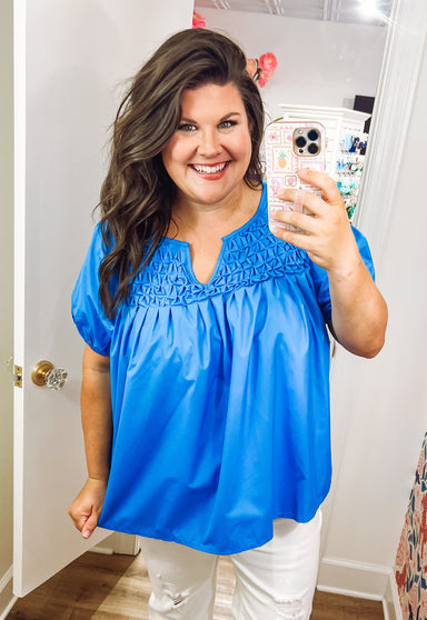 $52.00| /Available in XL-2X 100% Polyester Runs true to size with a smocked, stretchy bust! Jenna is wearing 2X.