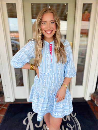 Light, breezy, and effortlessly feminine, this sky blue dress features delicate white embroidery throughout for a soft, elevated touch. Designed wi...