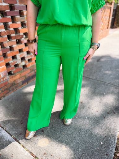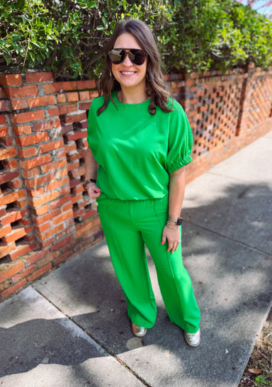 This effortlessly chic top brings a fresh pop of color with its vibrant green hue and polished contrast trim. Designed with a flattering split V-ne...