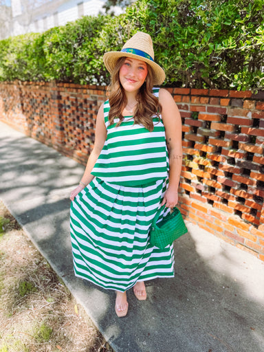 This striking striped midi skirt brings bold style and effortless elegance to your wardrobe. Featuring vibrant green and white stripes, it offers a...