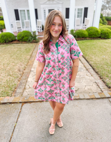 This charming botanical print mini dress blends playful style with feminine detail. Featuring a flattering contrast trim V-neckline, it adds a poli...