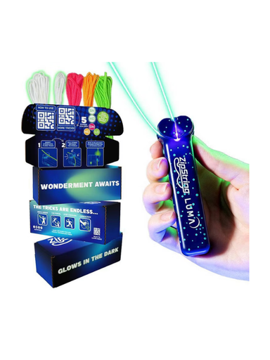 Light up the night with ZipString Luma — the glow-in-the-dark toy that flies a looped string for amazing tricks, shapes, and games.