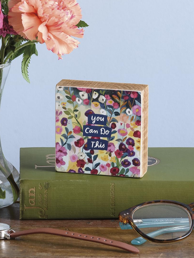 A wooden block sign featuring a vibrant color palette with whimsical floral designs and inspirational words. Sentiment reads "You Can Do This". Woo...