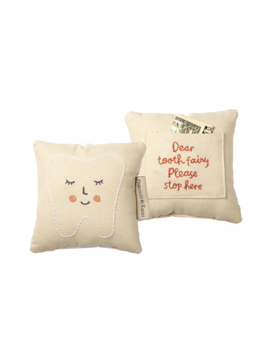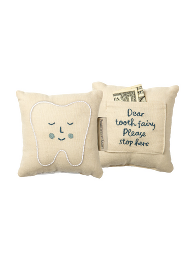 A double-sided cotton linen blend pillow featuring embroidered tooth design on front, and "Dear Tooth Fairy Please Stop Here" sentiment in blue on ...