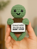 - IN-HOUSE DESIGN: Designed in calming shades of green and brown, this turtle holds a tiny crocheted message sign that reads, “It doesn’t matter how slow you go, DON’T STOP.” The sentiment is inspirational without being heavy, delivering a simple, powerful reminder in a lighthearted way. With a serene face, curved shell, and tiny legs, this turtle looks like it's in motion—even while bringing peace and stillness to the space it occupies.