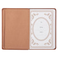 Tawny brown cover with heat-debossed frame and gold-foiled text, Faux leather cover, Gold-foiled accents, Flexcover, 101 daily devotions, 128 pages, Two-color interior, Attached ribbon marker, Presentation page , Size: 7.2” x 4.8” x .6” (183 x 122 x 15mm