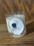 Scented wax candle features bubble glass jar with hand-painted oyster shell exterior.