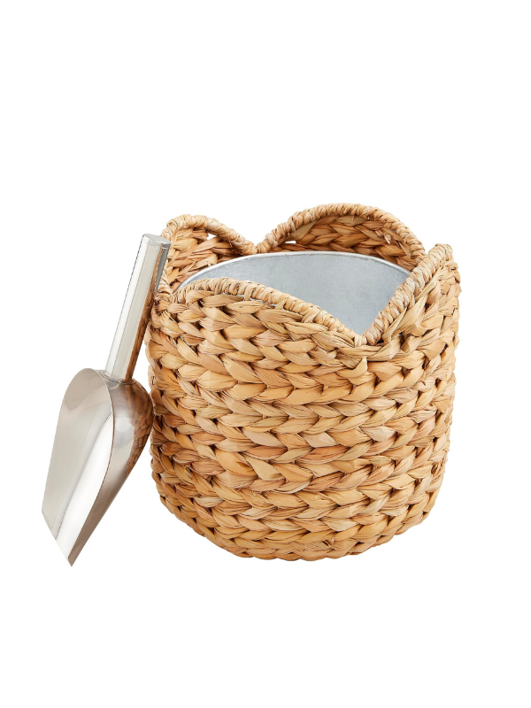 3-piece set. Tin ice bucket features water hyacinth basket sleeve. Comes with stainless steel ice scoop.